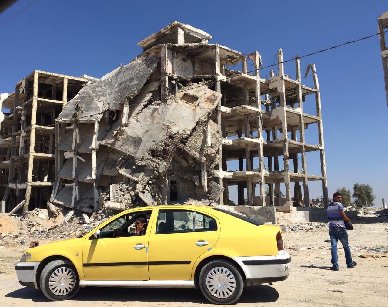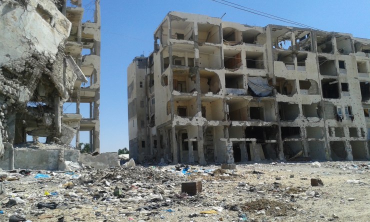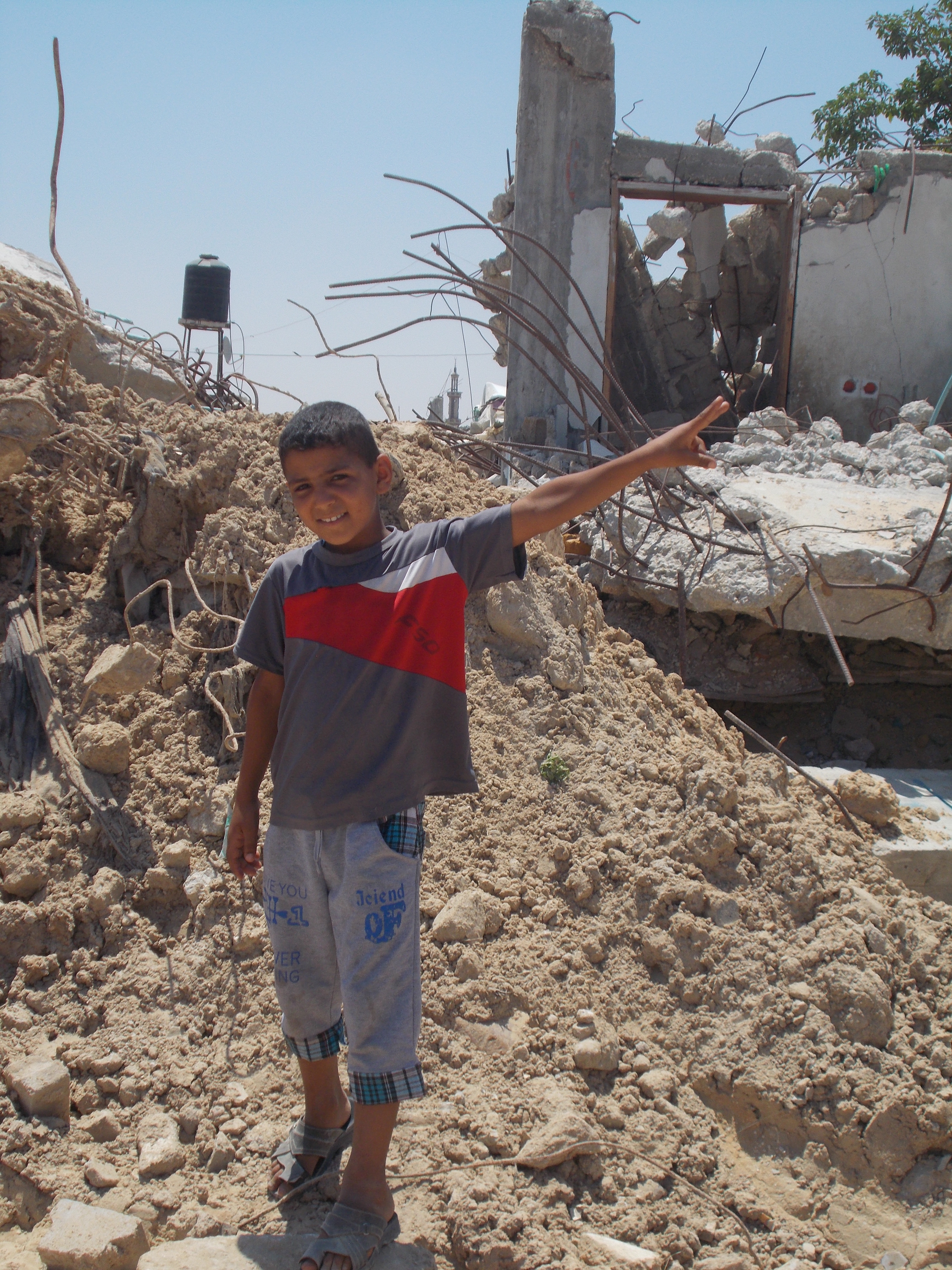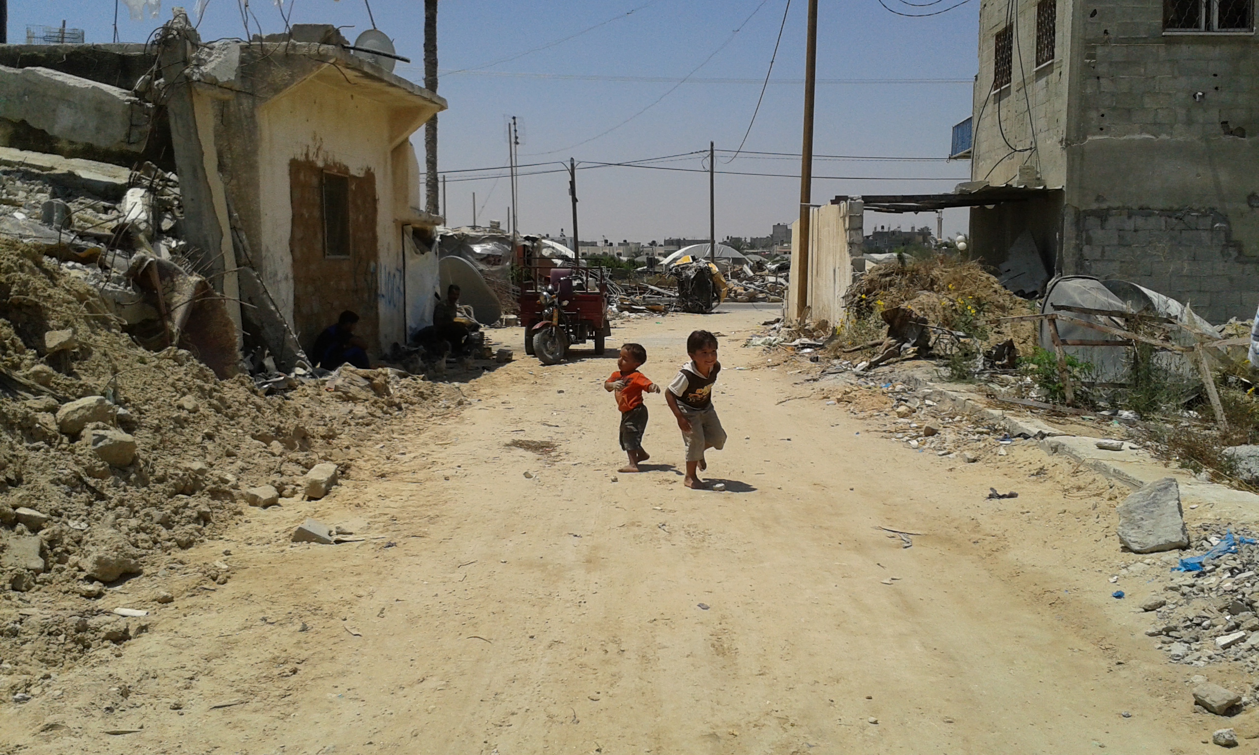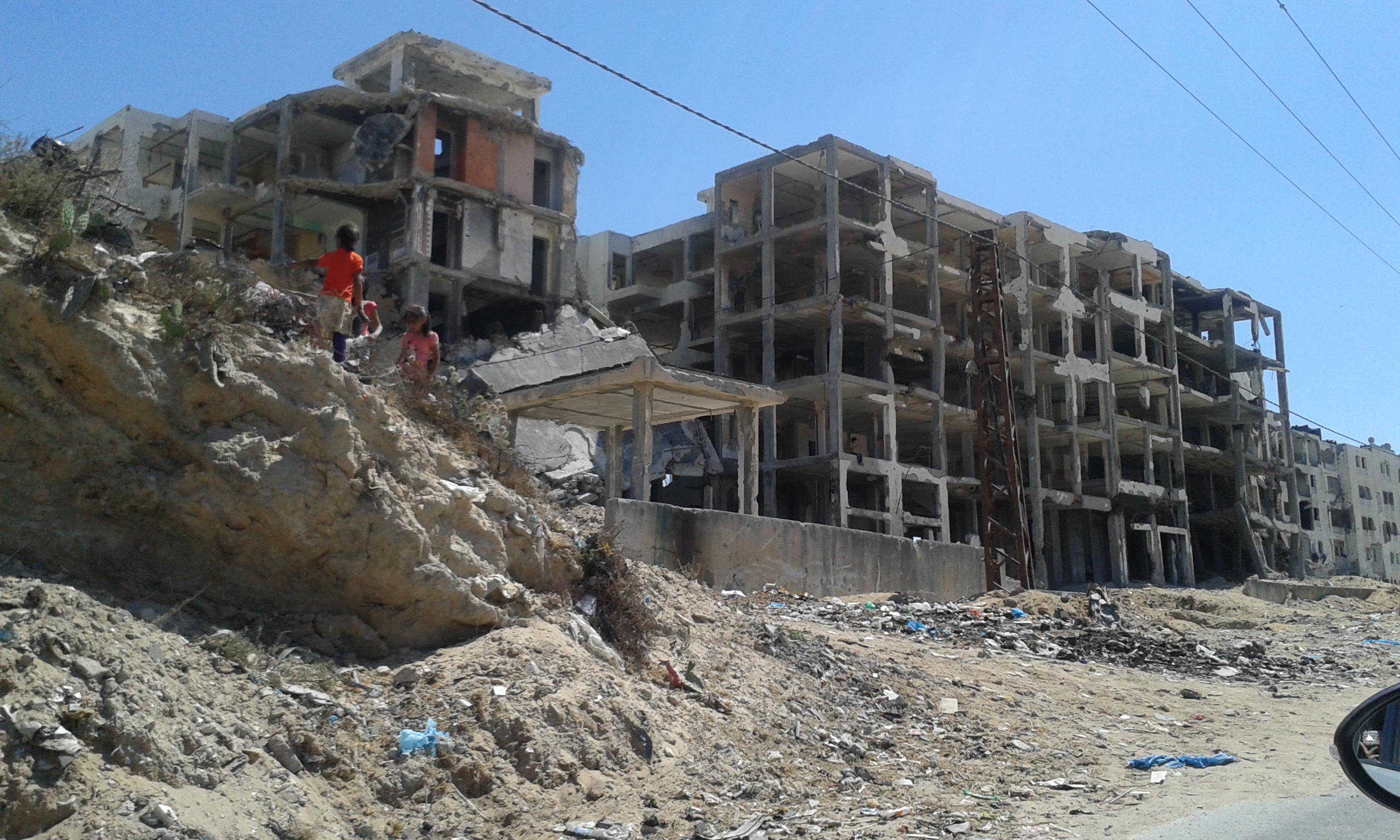 Dalla stradina polverosa, al di là dei piccoli cumuli di spazzatura che compaiono in mezzo alla terra arida e alle rovine di vite vissute non troppo tempo fa, si scorge in lontananza una linea di orizzonte verde. La rigogliosa Israele che a pochi passi continua la sua vita, come se l’orrore dell’estate scorsa non ci fosse mai stato. Appena vicino a questo luogo suggestivo ci sono delle costruzioni dilaniate.