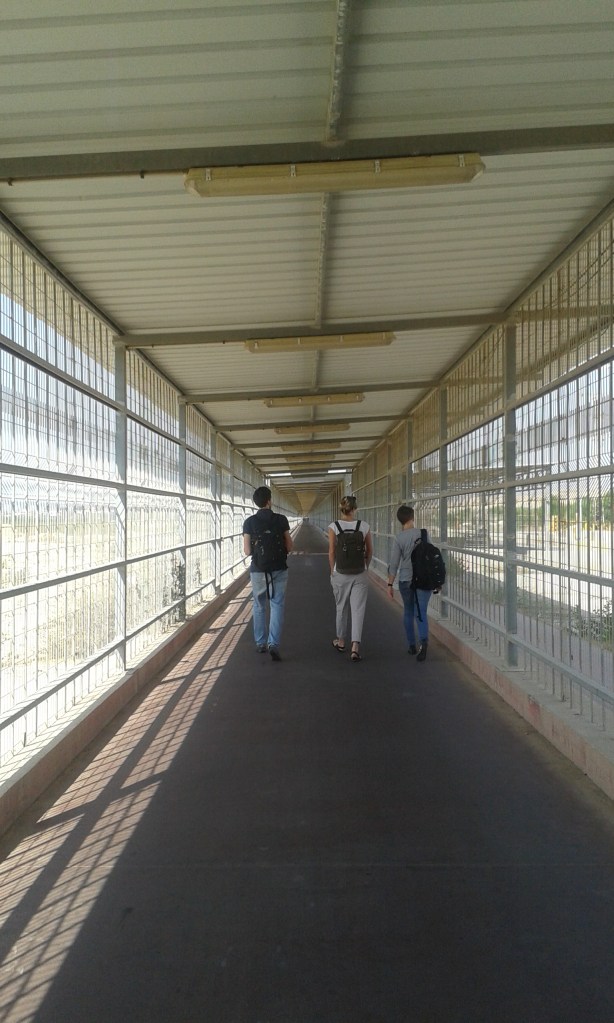 Realizzo che gesti per cui io non ho nessuna considerazione qui assumono importanza. Gesti come camminare verso casa, salire in macchina, prendere l’autobus sono sostituiti da parole come controllo, attesa, tornello e perquisizione. Quando scatta il verde il tornello immette in un corridoio lungo due chilometri e chiuso ai lati da una rete.