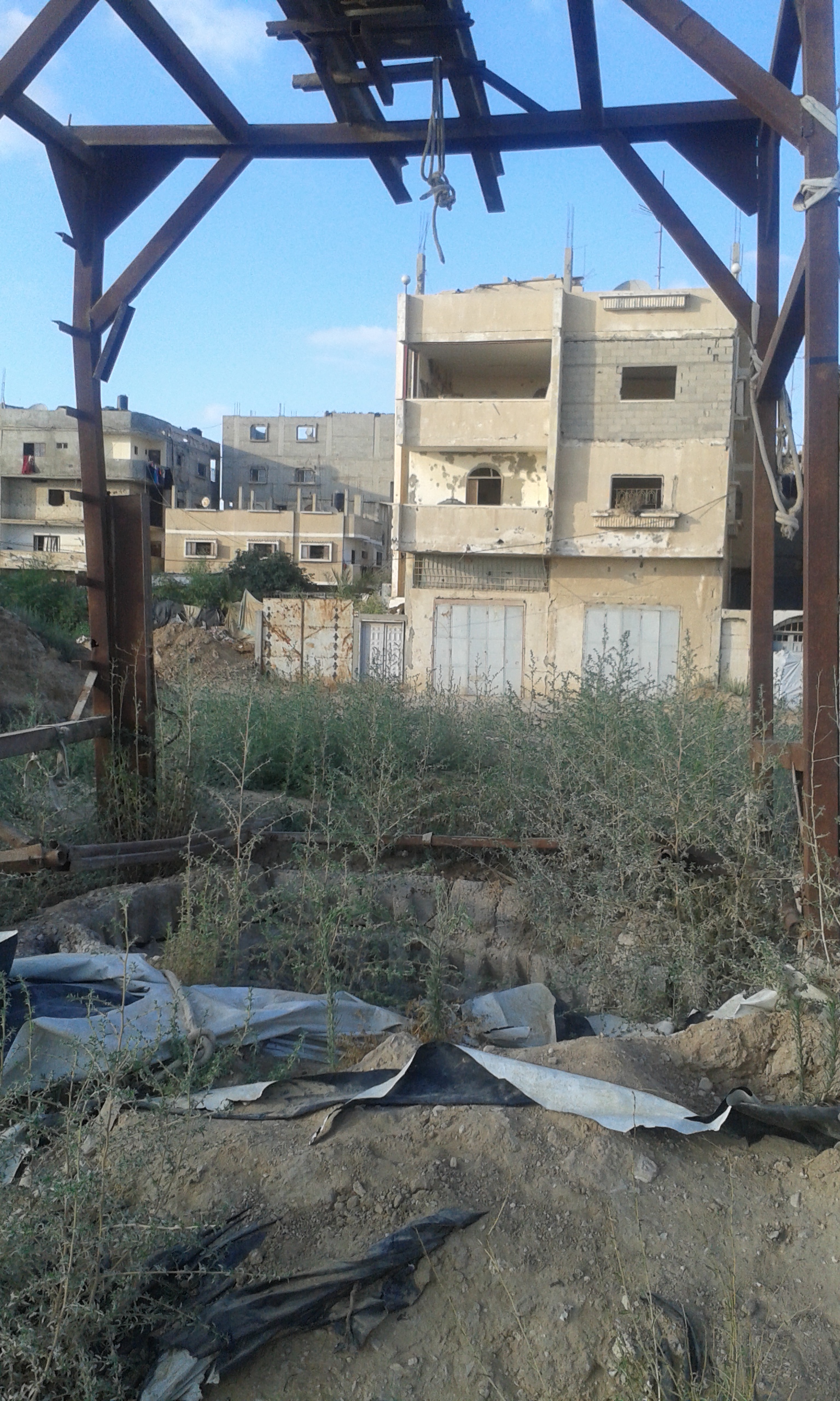 Alcuni bambini hanno costruito un’altalena usando ciò che è rimasto della porta di una casa. Le stradine strette si rincorrono fino ad arrivare ad una strada più ampia, al termine della quale ci sono i tunnel. Possiamo andarci perché accompagnati da un ragazzo che abita nella zona. La striscia di Gaza è blindata ormai dal 2007. L’economia è finta, poiché poggia quasi interamente sugli aiuti umanitari. L’embargo è una situazione per la quale è Israele a decidere cosa debba entrare e in quali quantità.