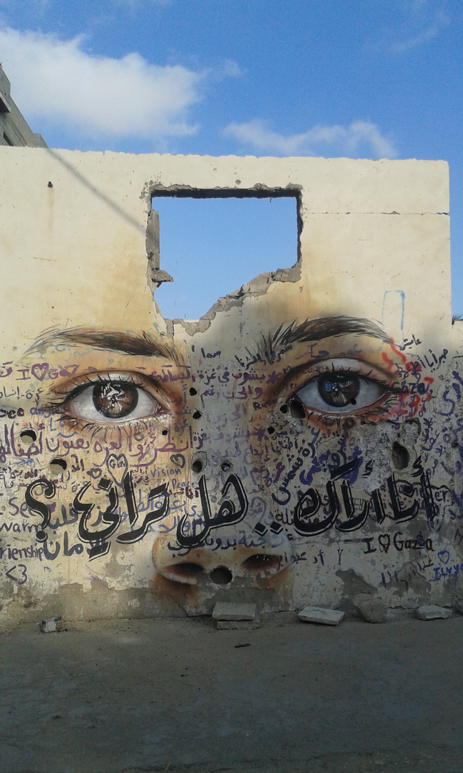 Andiamo al Nord, a Beit Hanoun e Tuffah, una zona vicina al confine Israeliano dove un artista tedesco insieme ad uno palestinese ha disegnato degli occhi di bambino sui muri. Per arrivarci passiamo all’interno di Shujaiyyah, attraversiamo ciò che è rimasto dopo i 51 giorni di bombardamento dell’estate scorsa.