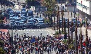 Quando arrivammo in prossimità della città di Genova, però, l’aria cominciò a farsi pesante e non era solo a causa del caldo. Ci fecero scendere prima della stazione di destinazione e dovemmo quindi ricorrere ad altri mezzi per ritrovare i punti di incontro. Arrivammo in una città surreale che non conoscevamo. La paura iniziò allora a farsi sentire ma eravamo tanti, eravamo uniti e assolutamente pacifici. I blocchi delle forze dell’ordine erano dappertutto, migliaia di agenti erano stati dispiegati in tutti i punti della città. Pensai subito che la guerra e le occupazioni militari dovevano somigliare a quello scenario. Il vasto dispiegamento di forze dell’ordine era così impressionante da dare l’illusione che a Genova ci fossero due eserciti contrapposti: uno, attrezzato, armato e monocolore, e l’altro, disorganizzato, quasi completamente disarmato e variopinto.