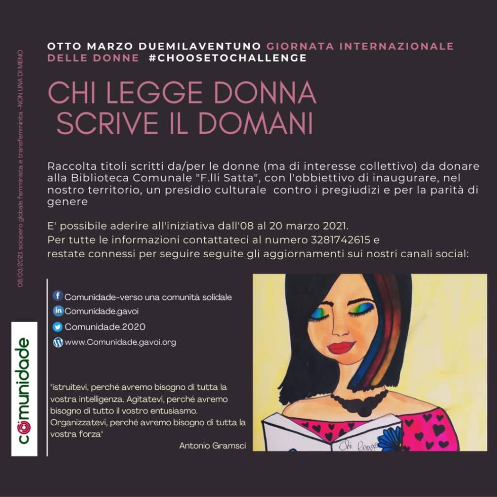 L’evento è stato ideato come una campagna di sensibilizzazione sul tema della parità di genere e una raccolta di libri e film, scritti da e per le donne ma fruibili da tutti, finalizzata all’inaugurazione all’interno della Biblioteca Comunale di Gavoi di una sezione dedicata ai Gender Studies.