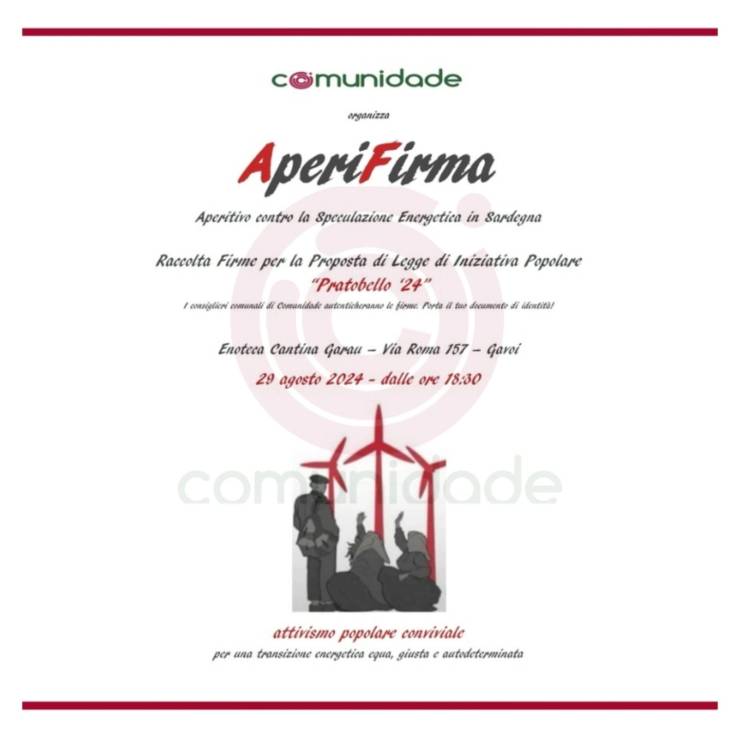 Il Movimento Comunidade organizza, infatti, un AperiFirma, Aperitivo contro la Speculazione Energetica in Sardegna evento che affiancherà alla sottoscrizione della proposta di legge un momento in cui confrontarsi brindando a un futuro di libertà, emancipazione, autodeterminazione.